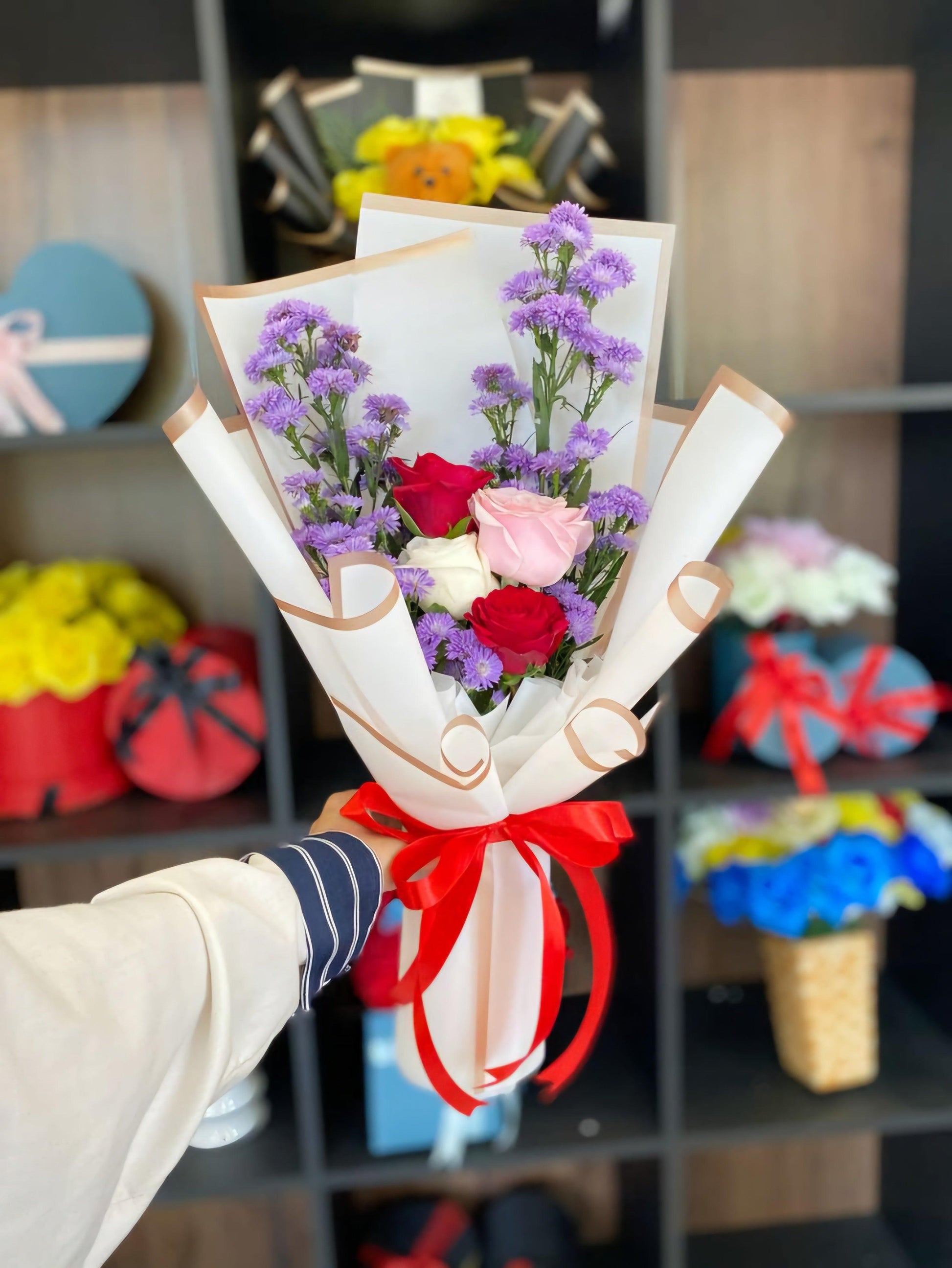 Bloom & Blush is a cheerful mix of charm and color, featuring radiant red and blush pink roses nestled among whimsical sprigs of lavender asters. Wrapped in crisp white paper with copper-toned edges and tied with a vibrant red ribbon, this bouquet is designed to brighten any heart and any room. Whether it’s a surprise date, a sweet apology, or just a “thinking of you” moment — this one's got your back