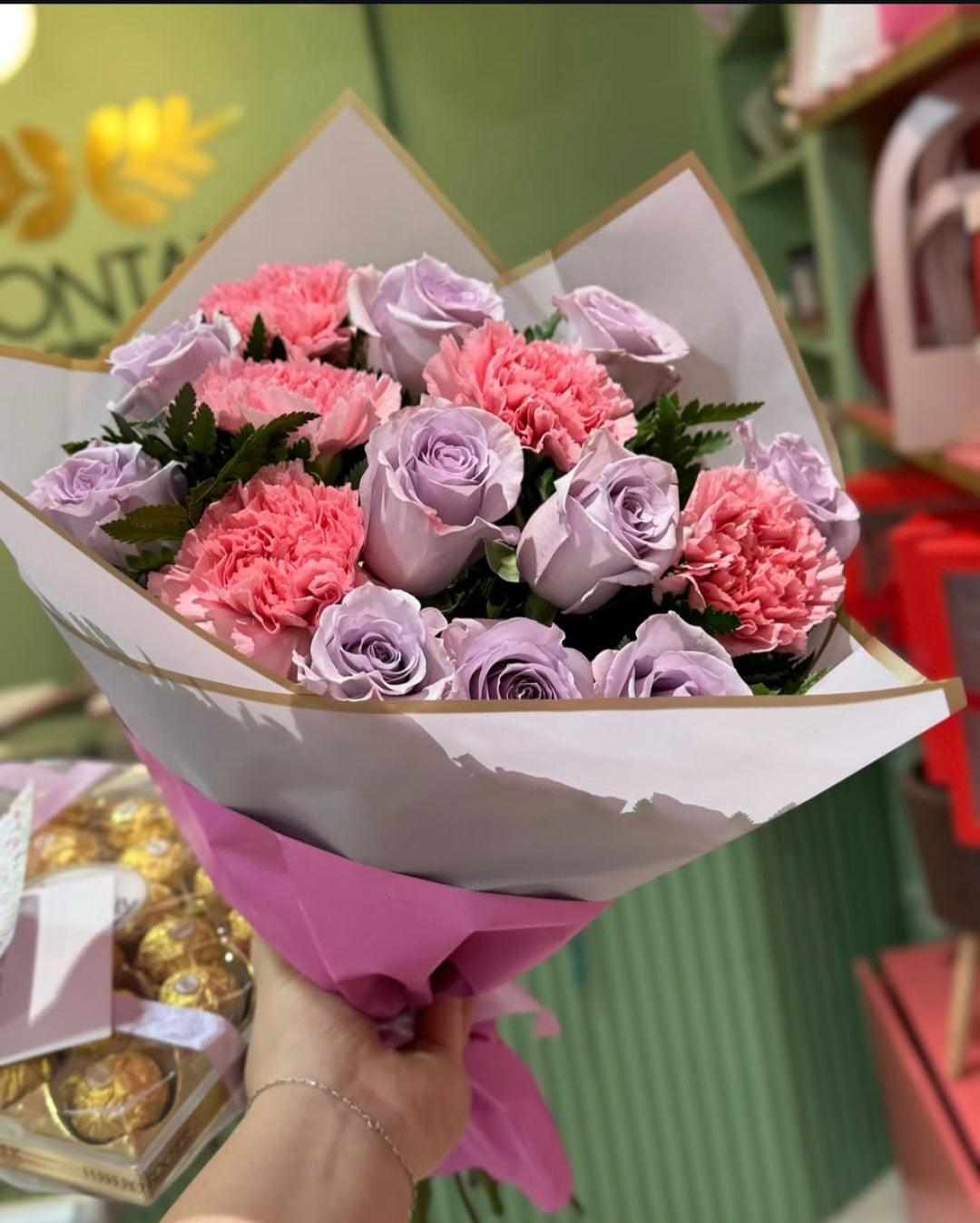 Indulge in the charm of our Lavender Bliss bouquet, a stunning mix of soft lavender roses and vibrant pink carnations, wrapped in elegant white paper with a delicate pink ribbon. Paired with a box of luxurious Ferrero Rocher chocolates, this bouquet is the perfect gift to express love, gratitude, or celebration. Ideal for birthdays, anniversaries, or any special moment that deserves a touch of sweetness and elegance. Order now to make someone’s day unforgettable!