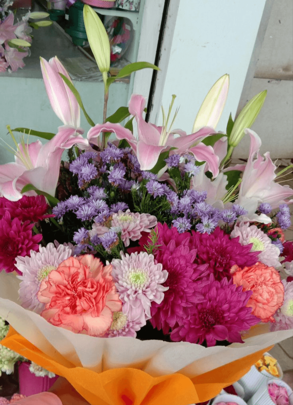 This stunning bouquet features a combination of beautiful roses, carnations, and lilies. The intricate design and vibrant colors make it the perfect gift for any special occasion. Brighten someone's day with this luxurious flower bouquet.